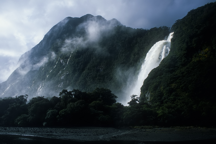 Milford Sound to jedno z najbardziej deszczowych miejsc na ziemi. W ciągu roku spada tu bowiem ponad 6 metrów deszczu. W deszczowe dni stoki fiordu pokrywają kaskady spływającej wody - powstają tysiące mniejszych i większych wodospadów. Zdjęcie zostało zrobione w Milford Sound po całonocnej ulewie.